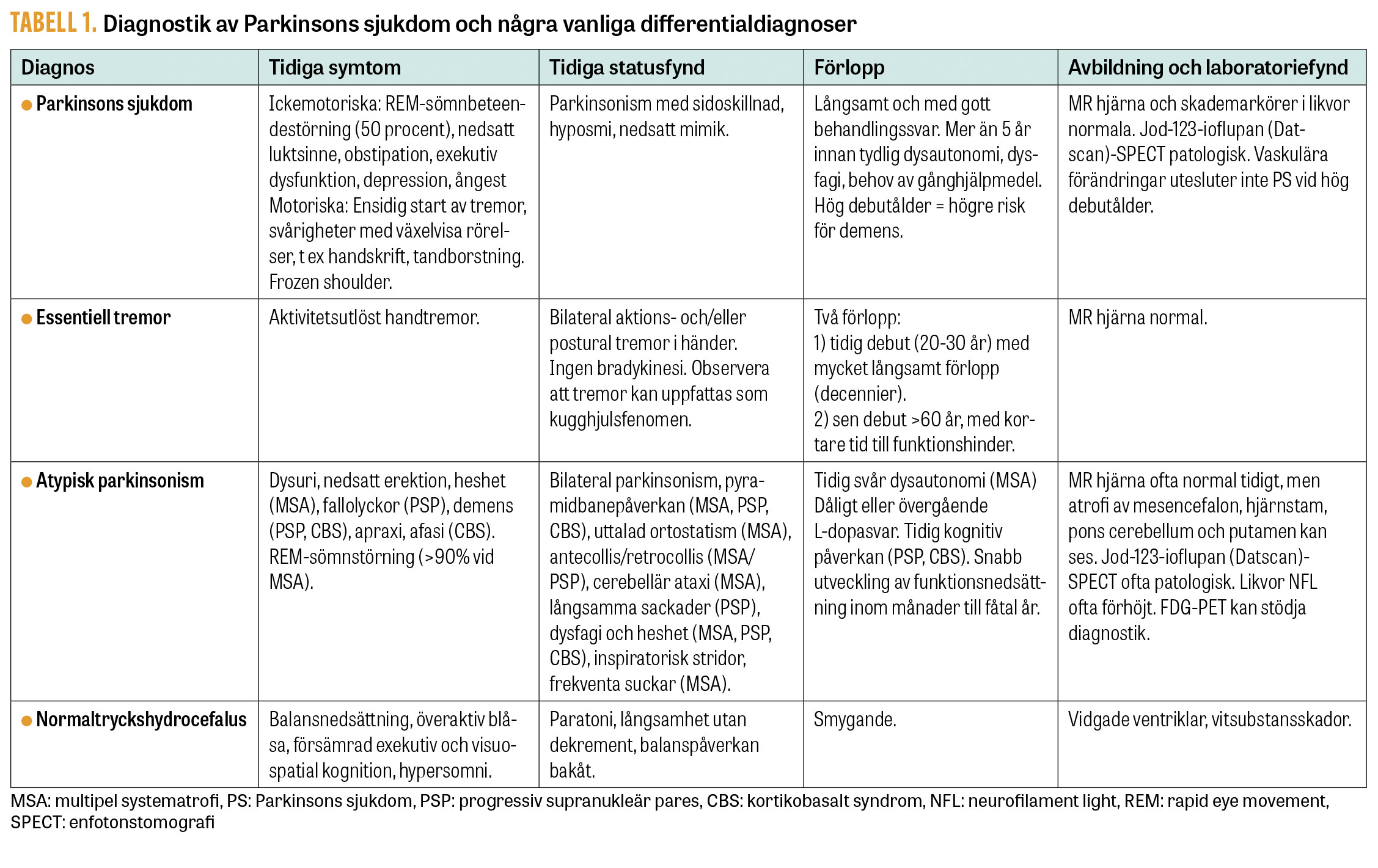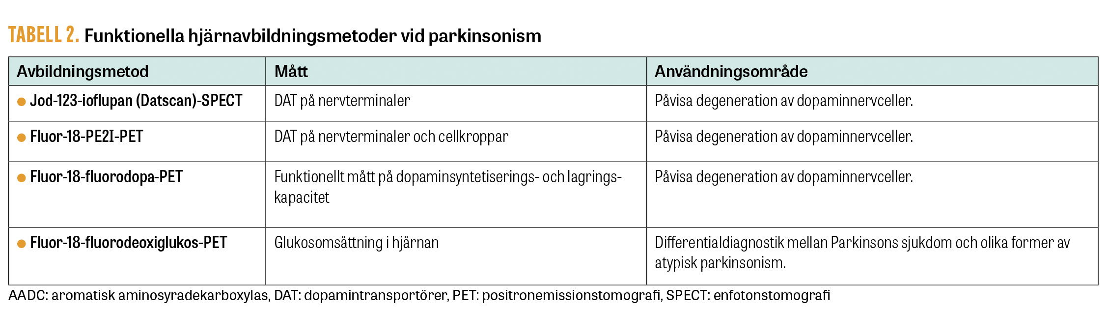 Parkinsonism är mycket starkt associerad med nedsatt dopaminsignalering i hjärnan. Presynaptisk orsak, som vid Parkinsons sjukdom, stöds därför av god behandlingseffekt av levodopa eller dopaminreceptoragonister. Eftersom behandlingssvaret ofta utvecklas successivt vid tidiga sjukdomsstadier ska test av akut behandlingsrespons (levodopa-test) dock inte användas diagnostiskt. Hjärnavbildande undersökningar används främst för att påvisa annan orsak till symtom eller samsjuklighet. Funktionell avbildning av dopaminsystemet kan bekräfta förlust av dopaminnervceller [12] (Tabell 2). Detta är användbart vid svårtolkad tremor eller vid misstanke om farmakologiskt orsakad parkinsonism, men undersökningen differentierar inte mot andra degenerativa sjukdomar med parkinsonism som multipel systematrofi, progressiv supranukleär pares och kortikobasalt syndrom. Funktionsavbildning med FDG-PET kan delvis differentiera mellan Parkinsons sjukdom och olika former av atypisk parkinsonism [13] (Tabell 2). MR-undersökning av hjärnan kan påvisa småkärlsskador eller mindre lakunära stroke i och kring de basala ganglierna, som ger upphov till gångsvårigheter, generellt förlångsammade rörelser och ibland tremor som konsekvens av hypertoni och diabetes mellitus, och som utgör en viktig samsjuklighet eller differentialdiagnosen sekundär parkinsonism.