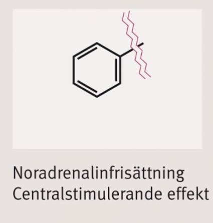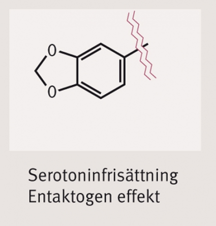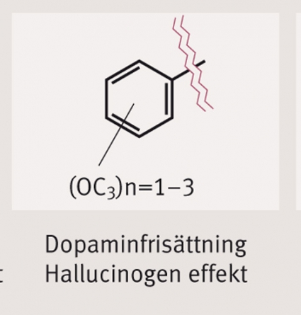 Ringvariationer i den kemiska strukturformeln av substituerade fenetylaminer modulerar frisättningen av monoaminer i hjärnan (Figur 1) [10]. Droger som frisätter noradrenalin verkar mest centralstimulerande, de som frisätter dopamin är mest hallucinogena och de som frisätter serotonin är mest entaktogena. Efter långvarigt bruk töms serotonerga depåer, och patienterna riskerar att utveckla negativa psykiska symtom med djupa depressioner och ibland psykoser.