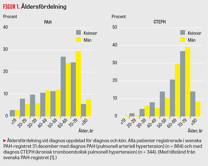 Pulmonell arteriell hypertension (PAH) och kronisk tromboembolisk pulmonell hypertension (CTEPH) är kroniska sjukdomar som kräver livslång behandling [1]. Patientgrupperna är förhållandevis små med en incidens för respektive sjukdom på 5 respektive 2 personer per miljon invånare och år [2, 3]. Cirka 500 patienter med pulmonell arteriell hypertension och 240 med kronisk tromboembolisk pulmonell hypertension levde i Sverige 2017 [2, 3]. Pulmonell arteriell hypertension drabbar främst kvinnor och en tredjedel insjuknar innan de fyllt 50 år, men könsskillnaden planar ut med ålder (Figur 1). Kronisk tromboembolisk pulmonell hypertension drabbar oftare män, och 75 procent av dem som insjuknar är äldre än 60 år.
