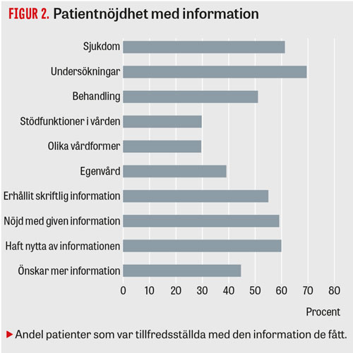 I vår studie angav 60 procent att de var nöjda med den information de fått och att den var till hjälp för att hantera sjukdomen [6]. Mest nöjda var patienterna med information om sjukdomen och undersökningar (Figur 2). Trots att många var nöjda ville 45 procent ha mer information, framför allt om rehabilitering, träning och arbete men även om möjligheten att bli botad. Att vara yngre än 65 år, ha ett bra stöd och socialt nätverk samt god förmåga att hantera sin diagnos var relaterat till att vara nöjd med informationen. Patienter med högre utbildningsnivå önskade mer information än de med lägre utbildningsnivå. Endast 3 procent angav att de ville ha mindre eller ingen information.