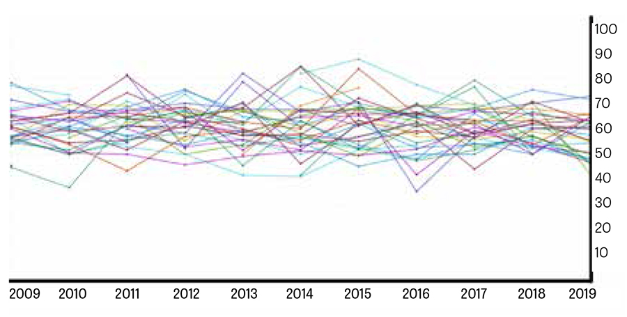 Figur 1. Andel (procent) nöjda patienter opererade för spinal stenos på landets rapporterande kliniker 2009–2019.