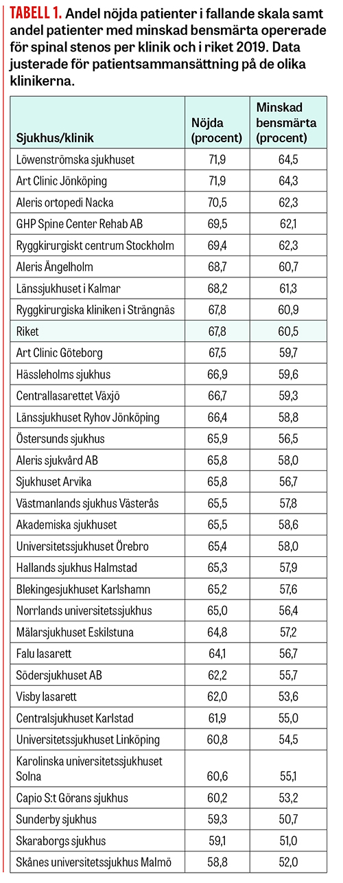 Vid en kvalitetskontroll av ryggkirurgin på Aleris ortopedi Nacka analyserades sjukhusets PROM-baserade resultat, rapporterade via Swespine till vardenisiffror.se, Sveriges Kommuner och regioners (SKR) offentliga nätpublikation över vårdkvalitet i Sverige. Resultatet 2009–2019 av det vanligaste ryggkirurgiska ingreppet, operation för spinal stenos i form av dekompression av nervrötter med eller utan steloperation, jämfördes med landets övriga kliniker. Utfallsmåtten var grad av »nöjdhet« (nöjd, tveksam, missnöjd) och »minskad bensmärta« (försvunnen, mycket bättre, något bättre, oförändrad, sämre) 1 år efter operation. Nämnda utfallsmått presenteras med och utan justering för patientsammansättning (patientmix) i databasen. Justeringen är baserad på de variabler som visats vara prediktiva för resultat inkluderande ålder, kön, rökning, preoperativ smärtnivå och poäng enligt skattningsskalorna EQ5D och ODI (Oswestry disability index) genom multipel regressionsanalys. Variablerna är valda på grund av att patientnöjdhet självklart är viktigt och på grund av att bensmärta är ett sjukdomsspecifikt huvudsymtom vid spinal stenos. De är också valda på grund av att de är lättförståeliga och kommunicerbara till patienter, till skillnad från ODI och EQ5D, som är typiska sjukdomsspecifika respektive generiska utfallsmått, men tekniskt svårförståeliga för lekmän.