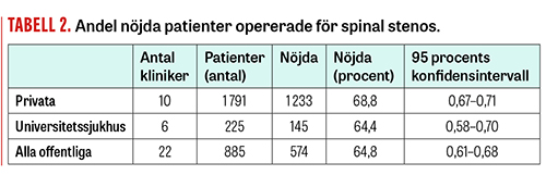 Differensen mellan privatkliniker och offentlig sjukvård var statistiskt säkerställd, dvs exkluderade 0-skillnad till privatklinikers fördel, vad gäller såväl nöjdhet (95KI 0,19–7,8 procent) som minskning av bensmärta (95KI 0,53–8,5 procent).