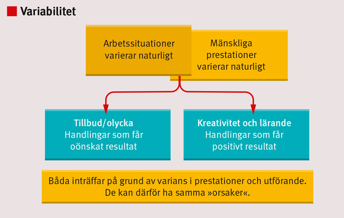 I komplexa system förekommer variabilitet naturligt och nödvändigt, både i förutsättningar för arbete och i individuella prestationer. De som ska utföra arbetet kan inte känna alla detaljer. Anpassningar är hela tiden nödvändiga för att individerna och systemet ska kunna anpassa sig till variabiliteten (adaptation). Detta innebär att samma handlingar (»orsaker«) kan leda till både önskade och oönskade resultat, se Figur 1. Att då kunna beskriva hur arbete utförs i verkligheten, till skillnad från arbete som det är tänkt (rutiner och riktlinjer), är nödvändigt för att förstå risker och olyckor.