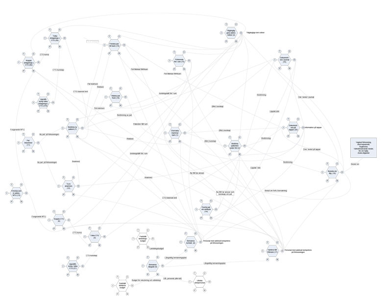 Figur 2. Beskrivning enligt funktionell resonansanalysmetod av arbetet på en förlossningsavdelning. Varje hexagon beskriver ett arbetsmoment (t ex anamnesupptagning eller tolkning av ankomst-CTG). Linjerna mellan hexagonerna representerar olika sorters kopplingar mellan aktiviteterna (vad som startar aktiviteten, vad den resulterar i, när den ska ske, vad som styr/kontrollerar den, vad som krävs för att den ska kunna ske samt vad som förbrukas under aktiviteten). Det är av modellen uppenbart att arbetet som utförs är komplext.
