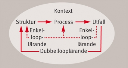 Figur 2 åskådliggör en modell som kombinerar triaden med kontext och lärandeloopar. Det mer begränsade enkellooplärandet, med fokus på anpassning och förbättring, kan avse både process och struktur, medan det djupare och mer genomgripande dubbellooplärandet påverkar verksamhetens struktur och därmed även dess process och utfall.