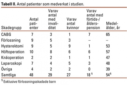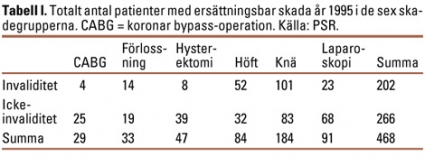 Studien omfattade patienter som år 1995 fick en ersättningsbar skada i samband med knäoperation, koronar bypass-operation (CABG), hysterektomi, laparoskopi vid i huvudsak gallstensoperation, höftoperation och förlossning. Dessa sex skadegrupper valdes ut, eftersom de var bland de största sett till antalet anmälningar till PSR. Förlossningsskadorna valdes särskilt ut på grund av deras svårighetsgrad. År 1995 fanns det totalt 468 patienter med ersättningsbar skada i de sex utvalda skadegrupperna (Tabell I).