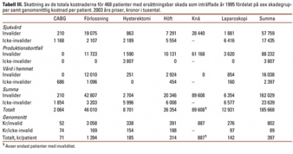 De skadegrupper som kan sägas vara de »tyngsta« sett utifrån de totala kostnaderna är patienter med förlossningsskada och patienter som skadas vid höft- och knäoperationer. Det ska dock noteras att det ingår endast två patienter som skadats i samband med knäoperationer i vårt material och att båda har drabbats av en invalidiserande skada. Jämför man kostnaderna per skadefall är det förlossningsskadorna som är dyrast (Tabell III). Det är framför allt invaliditet i samband med förlossning som bidrar till detta.