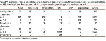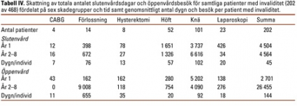 Sett över hela åttaårsperioden utgjorde kostnaden till följd av produktionsbortfall 50 procent av totalkostnaden, medan kostnaden för sjukvård utgjorde 40 procent och vård i hemmet svarade för resterande 10 procent. Patienter med någon grad av invaliditet stod för en mycket stor del av kostnaden: 87 procent av totalkostnaden. Uppföljningen visade att dessa patienter stod för ungefär 70 procent av det totala antalet slutenvårdsdagar och öppenvårdsbesök under åttaårsperioden (Tabell IV och Tabell V). Genomsnittskostnaden för patienter med invaliditet var nästan nio gånger högre än för patienter utan invaliditet.
