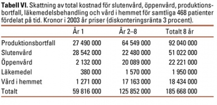Produktionsbortfallet värderades till genomsnittlig månadslön för heltidstjänst inom privat, kommunal och statlig sektor inklusive sociala avgifter och övriga lönekostnader. Samtliga priser avsåg år 2003. Om priset avsåg annat år har detta justerats med konsumentprisindex. Kostnaderna under de åtta åren har diskonterats till ett nuvärde med 3 procents diskonteringsränta, vilket följer Läkemedelsförmånsnämndens rekommendationer.