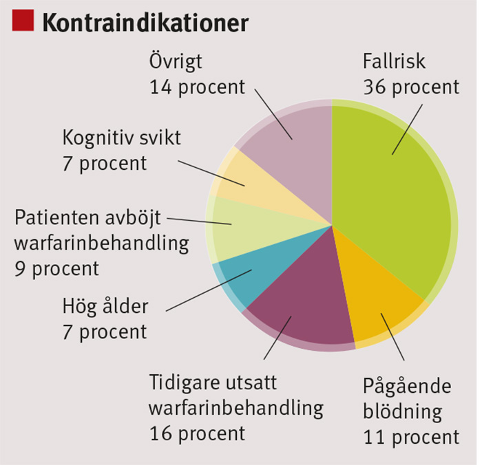 Information avseende i journal dokumenterad kontraindikation för warfarin kategoriserades som fallrisk, misslyckad warfarinbehandling i anamnes, pågående blödning (intra- och/eller extrakraniell), att patienten motsatt sig behandling, hög ålder, kognitiv påverkan, förmodad bristande ordinationsföljsamhet samt övrigt.
