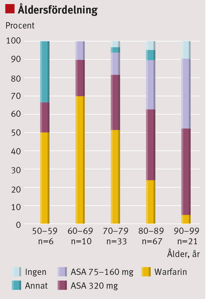 Vid val av preparat för strokeprevention bör flera faktorer beaktas, däribland strokerisk, blödningsrisk och samsjuklighet. Av patienter ≥80 år erhöll 81 procent inte warfarin vid utskrivning i vår studie. I samma patientgrupp fick 73 procent ASA. I en studie inkluderande alla patienter registrerade i RiksStroke under 2005 erhöll 31,5 procent av alla patienter med hjärninfarkt och förmaksflimmer warfarin vid utskrivning; 63 procent av dem i åldrarna 18–64 år och 9,1 procent av patienterna >85 år [2].