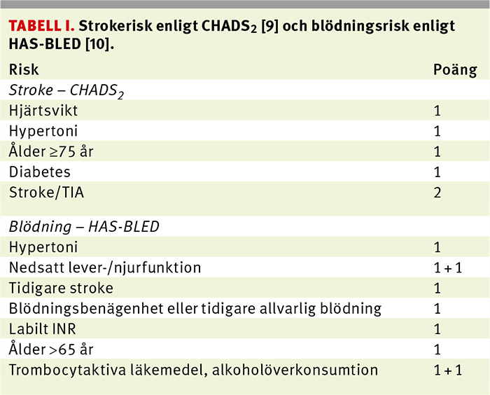 Patienterna identifierades via Riks-Stroke, varifrån uppgifter om riskfaktorer, medicinering och boendeform vid insjuknandet hämtades. Strokerisk fastställdes enligt CHADS2 [9] och blödningsrisk enligt HAS-BLED [10] (Tabell I) via uppgifter ur patientjournal. Förekomst av de respektive variablerna i de båda skattningsskalorna kategoriserades som »ja« eller »nej«; avsaknad av uppgift klassificerades som »nej«. Hög strokerisk definierades som CHADS2-poäng >3 och hög blödningsrisk som HAS-BLED >3.