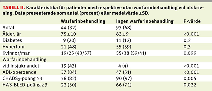 Patienter utan warfarinbehandling var äldre (medel 83 vs 73 år; P = 0,0001), oftare primärt ADL-beroende före stroke (84 procent vs 51 procent, P = 0,0002) och med högre strokerisk (CHADS2-poäng >3 [97 procent vs 82 procent; P = 0,005]) liksom högre blödningsrisk (HAS-BLED-poäng >3 [71 procent vs 50 procent; P = 0,02]) jämfört med warfarinbehandlade patienter (Tabell II). Totalt 66 procent av patienter utan warfarinbehandling hade mycket hög strokerisk, CHADS2-poäng >4.