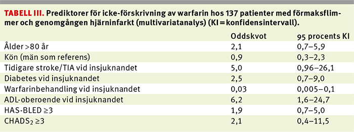 Mer än två tredjedelar av patienterna med hjärninfarkt och förmaksflimmer fick inte warfarinbehandling vid utskrivning i Malmö under 2008. Endast 6 patienter (6,5 procent) av dem som inte fick warfarin hade en dokumenterad plan för insättning efter utskrivning. Enligt data från antikoagulationsmottagningen vid Koagulationscentrum, Skånes universitetssjukhus i Malmö, fick 2 respektive 4 av 93 patienter warfarin inom 3 månader respektive 1 år efter utskrivning. Kort vårdtid skulle annars ha varit en tänkbar bidragande orsak till låg förskrivningsfrekvens i vår studie.