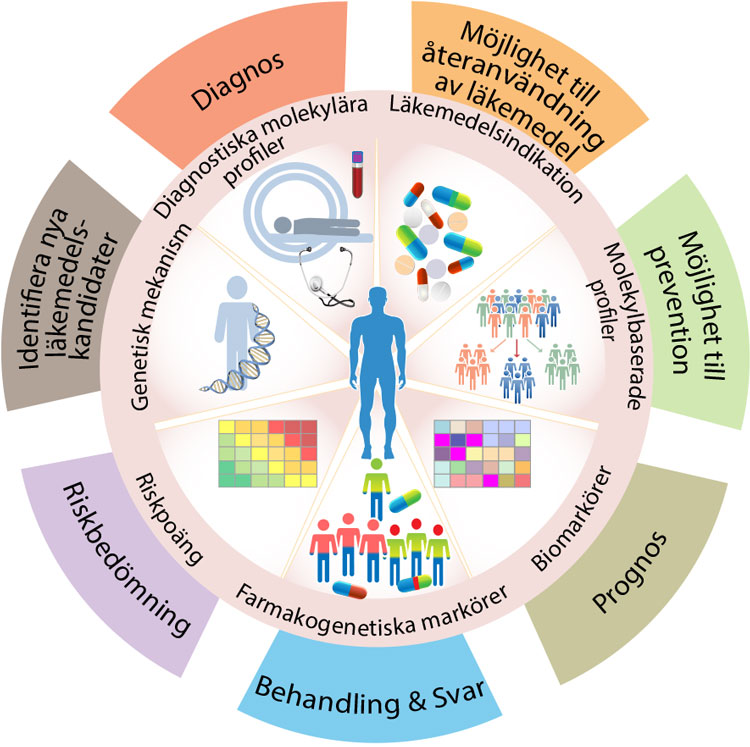 Komplexa sjukdomar utgörs till stor del av våra vanliga folksjukdomar, som har gemensamt att ärftlighet, miljöfaktorer och livsstil både påverkar risken att insjukna och svårighetsgrad hos de drabbade. Kunskap om genetik och underliggande sjukdomsmekanismer utgör en bas för precisionsmedicin. De enorma framsteg som gjorts inom genomikområdet de senaste åren har möjliggjort analyser av DNA, RNA, proteiner och metaboliter i förhållande till olika sjukdomar, inklusive de komplexa sjukdomarna. Tillgång till omikdata, tillsammans med anamnes och kliniska undersökningar, har således öppnat för helt nya möjligheter [1].