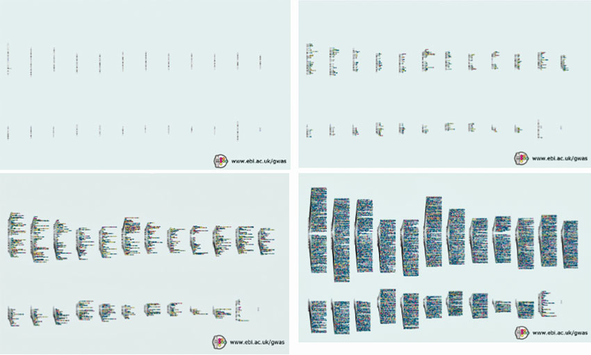 Figur 2. Antalet identifierade lokus per kromosom för olika sjukdomar och egenskaper har ökat explosionsartat mellan åren 2006 och 2019. Bilder från: NHGRI-EBI Catalog of human genome-wide association studies (https://www.ebi.ac.uk/gwas/docs/diagram-downloads), med tillstånd.