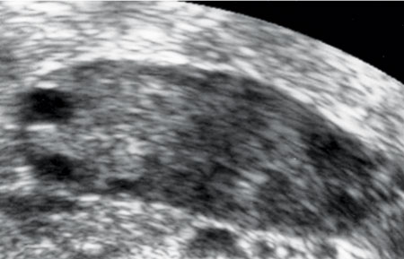 Figur 1. Ultraljudsbild av ena ovariet hos en 34-årig kvinna med prematur ovariell insufficiens. Ovariet mäter 26 mm i största diameter och volymen är 4 ml. Storleken motsvarar ett postmenopausalt ovarium.