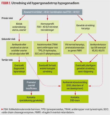 Figur 2 visar en översikt av utredningsgången som initialt kan göras i gynekologisk öppenvård (primär nivå), därefter av gynekolog med specialkunskap i gynekologisk endokrinologi (sekundär nivå) och slutligen vid nationella specialistcentrum med tillgång till endokrinologisk, gynekologisk, kirurgisk och genetisk kompetens i ett DSD-team (tertiär nivå). Anamnesen kan oftast avslöja eventuell sekundär POI efter kirurgi, cytostatikabehandling eller strålning. Den kliniska undersökningen kan i många fall direkt leda till misstanke om en specifik diagnos, till exempel Turners syndrom. I de fallen bör utredningen fokusera direkt på den misstänkta diagnosen, inklusive genetisk diagnostik och rådgivning. I samtliga fall är det viktigt att bekräfta tillståndet hypergonadotrop hypogonadism med upprepad provtagning av FSH samt utesluta avvikelser/avsaknad av uterus och ovarier. Vid normala fynd fortsätter utredningen med undersökning för autoimmunitet och genetiska avvikelser.