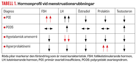 Menstruationsrubbningar kan orsakas av många olika underliggande tillstånd såsom stor viktförändring, nydebuterad diabetes och graviditet, men de vanligaste orsakerna till sekundär amenorré är polycystiskt ovariesyndrom (PCOS), hyperprolaktinemi, hypotalamisk amenorré och POI. Hormonprofilen vid provtagning är dock helt olika vid dessa tillstånd (Tabell 1).