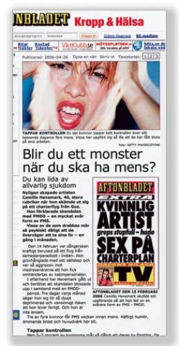 PMDD har ofta kommenterats i dagspressen. Aftonbladet (5 maj 2002) skriver att »upp till åtta procent drabbas av ett okänt syndrom före mens« och att »kvinnan känner sig labil, faller lättare i gråt och får aggressionsutbrott«. Det framförs att ca 5 procent av alla fertila kvinnor har så svåra besvär att de kan drabbas av självmordstankar dagarna före menstruationen. I Dagens Medicin (25 maj 2005) presenteras en avhandling om premenstruell dysfori av en gynekolog, som anges hävda att »premenstruella besvär är ett dolt folkhälsoproblem med betydande konsekvenser för de drabbade och samhället«. Dagens Nyheter (1 dec 2005) rapporterar från riksstämman: »Lyckopiller lindrar svåra PMS-besvär«, enligt en studie av en klinisk farmakolog. Det anges att underförskrivningen av SSRI vid PMDD beror på okunskap hos läkare. I samband med en rapport om ett nytt p-piller 2006 uppmärksammades PMDD i Aftonbladet (Figur 1). Avsikten med denna artikel är att i biomedicinskt och genusvetenskapligt perspektiv diskutera definitioner, förekomst, symtomatologi, förklaringsmodeller och behandling av PMDD. Dessutom är avsikten att diskutera hur denna »diagnos« marknadsförs.