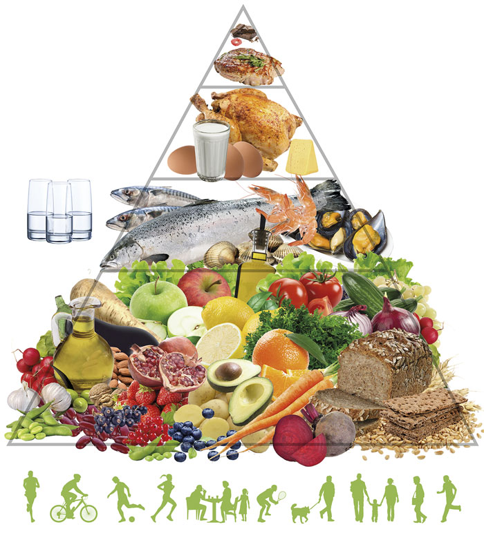 Pyramiden visar innehåll och ungefärlig fördelning i ett hälsosamt matmönster. Råd om mat behöver nästan alltid kombineras med anpassade råd om fysisk aktivitet. Bild från Sundkurs.se