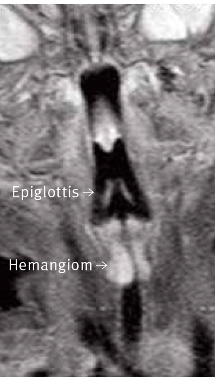 Vid öronläkares bedömning påvisades laryngoskopiskt ett högt sittande subglottiskt hinder med svullnad och rodnad, som sträckte sig ner mot larynxregionen. Ultraljuds- och MR-undersökning visade en förändring, som till stor del inskränkte trakeallumen och subglottiska larynx och med ekogenitet och utseende som vid hemangiom (Figur 1). Efter kontroll av blodtryck och EKG, som visade normala fynd, inleddes behandling med propranolol med begynnelsedosen 1 mg/ kg/ dygn uppdelad på 3 doser. Trots indragningar och stridor hade flickan god saturation (pO2 >95 procent) och var för övrigt välmående, varför inga glukokortikoider gavs.