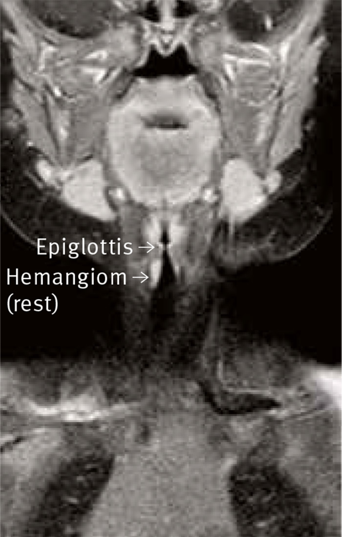 Under de följande månaderna mådde flickan bra. Vid kontroll 3 månader efter behandlingsstarten konstaterades att hon var helt symtomfri. Vid ultraljudsundersökning påvisades ingen påtaglig förändring av hemangiomet, men med förnyad MR-undersökning konstaterades att den kliniskt goda effekten av medicineringen också hade ett morfologiskt korrelat: I posterolaterala väggen av subglottiska trakea sågs en påtagligt förminskad förändring, en maximalt 2 mm djup, 5–6 mm bred och kranialt–kaudalt 7 mm lång bågformad, kontrastuppladdande rest (Figur 2).