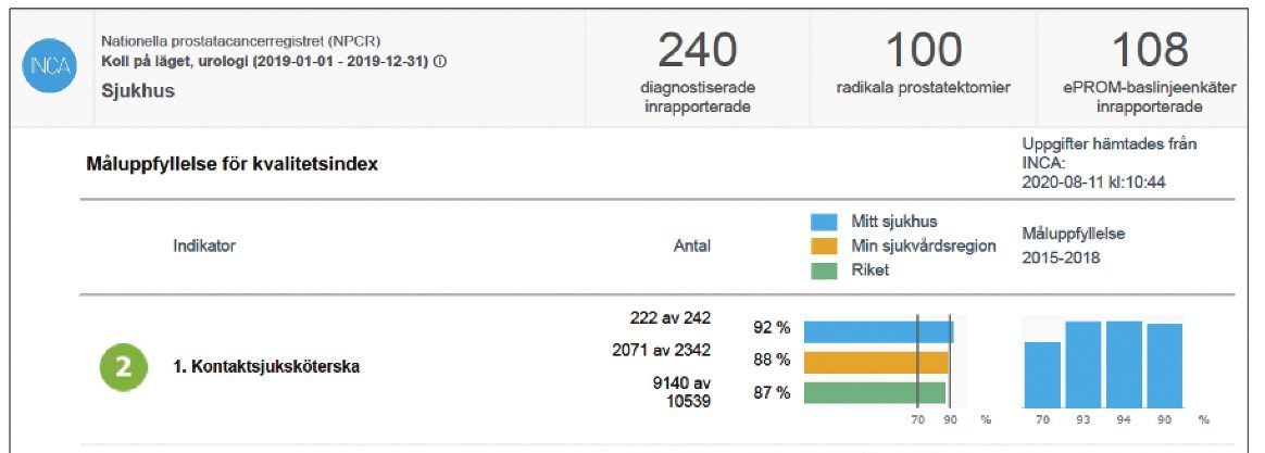 Kvalitetsregistrets betydelse för sjukvård och forskning. Nationella prostatacancerregistret (NPCR) är rikstäckande sedan 1998. År 2008 blev registreringen datoriserad, antalet variabler utökades och patientrapporterade utfallsmått (PROM) infördes. Numera finns en stor del av uppgifterna allmänt tillgängliga som interaktiva rapporter på npcr.se. På senare år har ett nationellt digitalt grafiskt beslutsstöd utvecklats: individuell patientöversikt (IPÖ) för prostatacancer.