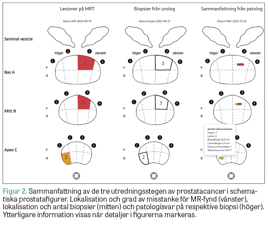 NPCR och RCC har med stöd av Prostatacancerförbundet tagit fram digitala nationella strukturerade diagnostikmallar för de tre stegen i prostatacancerdiagnostiken (MR, biopsitagning och patologi). Under utredningen fylls de tre mallarna i av radiolog, urolog och patolog, vilket automatiskt genererar remissvar till journal. Informationen skickas till Inca, IPÖ-PC och NPCR, vilket avsevärt minskar behovet av manuell efterregistrering i NPCR. Informationsinhämtningen i kliniken underlättas genom att de tre utredningsstegen presenteras bredvid varandra i schematiska figurer (Figur 2). Den insamlade informationen möjliggör utvärdering av diagnostiken på klinik-, region- och nationell nivå. Mallarna testas nu i Helsingborg och Ängelholm [5], och målet är att utvidga införandet till fler regioner under 2024.