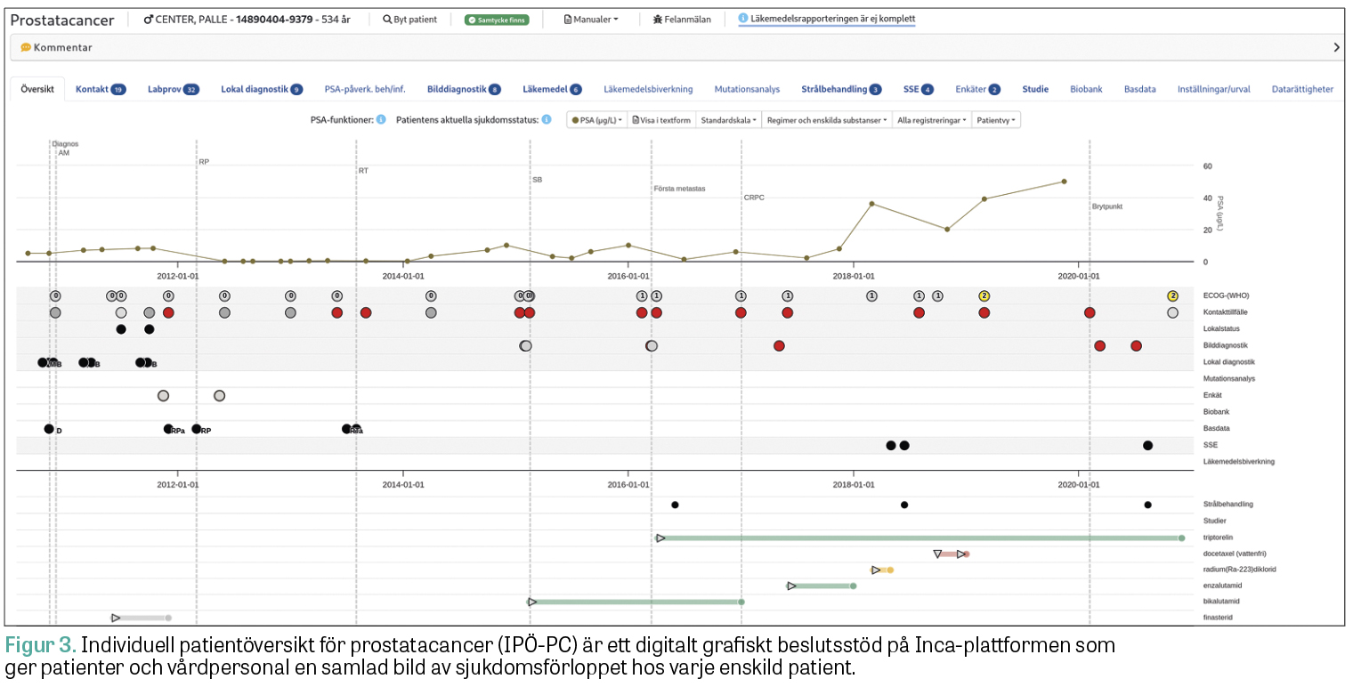 Individuell patientöversikt för prostatacancer (IPÖ-PC) är ett nationellt digitalt grafiskt beslutsstöd med målet att underlätta delaktighet, verksamhetsuppföljning och forskning. Det används tillsammans med patientjournalen för att ge vårdpersonal och patienter en gemensam bild av prostatacancerpatientens sjukdomsförlopp (Figur 3).