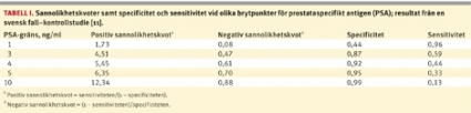 Ingen brytpunkt för PSA uppnådde de önskvärda positiva och negativa sannolikhetskvoterna 10 respektive 0,1. Med brytpunkten 4,0 ng/ml för PSA var positiv kvot 5,5 och negativ kvot 0,6 (Tabell I). Vid PSA under 1,0 ng/ml var risken mycket liten (1,2 procent) för en framtida aggressiv prostatacancer, medan högre PSA-nivåer innebar en successivt ökande risk för prostatacancer [11].