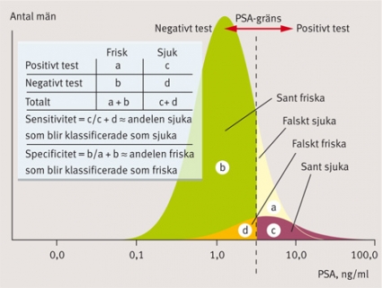 Orsaken till att PSA-testet inte uppfyller kriterierna för ett screeningtest är att fördelningen av PSA bland män som senare diagnostiseras med prostatacancer och bland friska män till stor del är överlappande (Figur 1) [11]. Om man extrapolerar dessa data till hela befolkningen och antar en prevalens för prostatacancer på 10 procent, blir det tydligt att nästan oavsett vilken gräns för PSA man väljer så kommer många män som får positivt testvärde inte att diagnostiseras med prostatacancer (Figur 2). Med andra ord kommer en stor andel friska män att genomgå onödiga undersökningar. Om brytpunkten läggs så högt att majoriteten av dem som har PSA-värden över denna har cancer, kommer alltför många av de diagnostiserade cancrarna att redan vara obotliga.