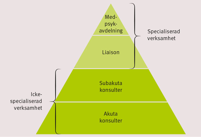 Schematiskt kan man beskriva konsultation–liaisonpsykiatrins arbetsfält i form av en pyramid (Figur 1). Framställningen bygger på det stora sjukhusets situation men gäller för tillämpliga delar i princip även mindre sjukhus.