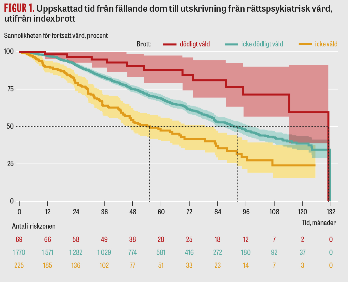 Våra resultat visade att individer som dömts till rättspsykiatrisk vård vårdades – i både sluten- och öppenvård – i genomsnitt 7,5 år. Personer som begått våldsbrott (Figur 1), personer vars dom förenats med särskild utskrivningsprövning samt de som lider av psykossjukdom eller har en historik av missbruksproblematik bereds rättspsykiatrisk vård under längre tid än de som saknar dessa klinisk-kriminologiska karakteristika. Frekvensen av återfall i brott efter utskrivning uppskattades vara ungefär 14 procent efter 1 år och sammanlagt 20 procent efter 2 år; motsvarande siffror för våldsbrott var 6 procent efter 1 år och 10 procent efter 2 år.