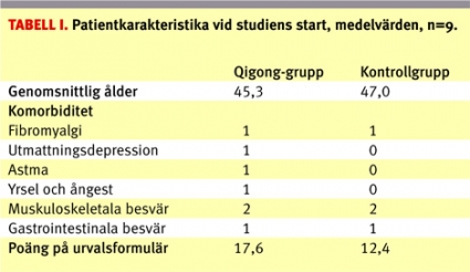 I Tabell I redovisas patientkarakteristika. Patienterna var i genomsnitt 46 år, medianvärde 47 år, och hade i genomsnitt 15 poäng i urvalsformuläret. Åtta patienter hade inte varit sjukskrivna under de senaste två månaderna före studiens start, medan de övriga hade varit sjukskrivna i mer eller mindre grad under 4–8 veckor före studiestarten. Qigong-gruppen var i genomsnitt något yngre än kontrollgruppen och hade något lägre utbildning. Det fanns måttliga skillnader i komorbiditet, dvs sjukdomstillstånd utöver inklusionssymtomen. Inga skillnader mellan grupperna redovisade i Tabell I var signifikanta men har betydelse då qigong-gruppen hade något sämre utgångsläge.