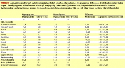 Även symtominstrumentet uppvisade skillnader såtillvida att antalet rapporterade symtom tenderade att minska mer i qigong-gruppen än i kontrollgruppen. Symtomrapporteringen i qigong-gruppen minskade framför allt inom området stress– depression–spänning, medan kontrollgruppens profil var relativt oförändrad. Aktivitetsinstrumentet däremot uppvisade enbart små skillnader, dessutom till qigong-gruppens nackdel (Tabell II).