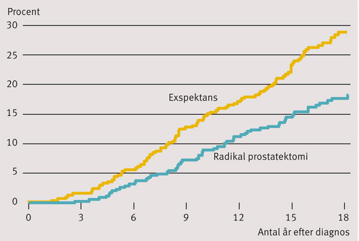 Det viktigaste bidraget kom från en populationsbaserad kohort av 223 män i Örebro län som diagnostiserades med lokaliserad prostatacancer 1977–1983 och sedan följdes minutiöst [1]. Efter 32 års uppföljning utan initial behandling – när endast tre män alltjämt var i livet – hade 17 procent av patienterna dött på grund av prostatacancer och 83 procent av andra orsaker. Flera mindre studier visade samstämmiga resultat. Det stod alltså klart att möjligheterna till förbättrad överlevnad genom tidig radikal behandling var små, åtminstone i ett relativt kort tidsperspektiv. Denna insikt låg till grund för vårt beslut 1988 att planlägga en randomiserad studie (SPCG-4) för att klarlägga om dödligheten i prostatacancer kan reduceras med tidig radikal behandling. Nu, 26 år senare, är denna studie alltjämt den enda i sitt slag i världen med patienter med huvudsakligen kliniskt upptäckt prostatacancer.