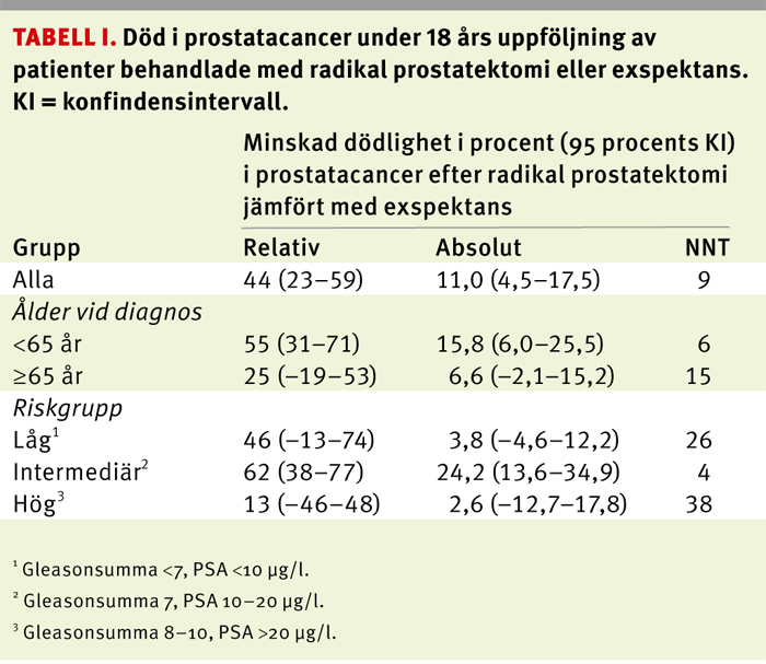 Studiens resultat finns sammanfattade i Tabell I. Huvudbudskapet är att under de första 18 årens uppföljning minskade radikal prostatektomi död i prostatacancer med 44 procent (95 procents konfidensintervall, KI, 23–59; P = 0,001) motsvarande 11 procent (95 procents KI 4,5–17,5) lägre kumulativ absolut dödsrisk (28,7 procent efter exspektans jämfört med 17,7 procent efter radikal prostatektomi). Antalet dödsfall i prostatacancer var 63 bland de 347 män som randomiserades till radikal prostatektomi och 99 bland de 348 som randomiserades till exspektans. Med förlängd uppföljningstid, från 10 till 18 år, har NNT minskat från 20 till 8. Biverkningarna av operationen drabbar naturligtvis dessa åtta män med lika stor sannolikhet, oavsett om operationen är dem till gagn. Ett oväntat fynd är att nyttan med radikal prostatektomi gradvis minskade med stigande ålder (Tabell I). Eftersom analysen är explorativ och resultatet saknar en uppenbar biologisk förklaring förespråkar vi en försiktig tolkning [6, 7].