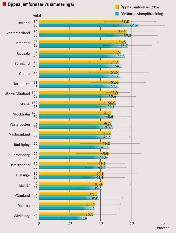 Simuleringen visar att en variation mellan landsting på 35–59 procent inte alls är förvånande. I själva verket är den variation man kan förvänta sig av ren slump något större: 31–65 procent.