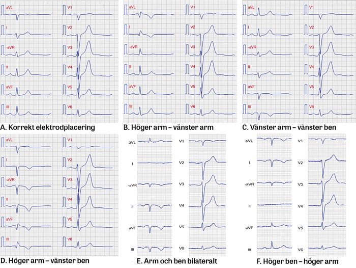 När höger armelektrod placeras på vänster ben och vice versa påverkas samtliga extremitetsavledningar utom aVL. Avledning II inverteras. Avledning I mäter nu potentialskillnaden mellan vänster arm och vänster ben, och avledning III mäter potentialskillnaden mellan höger arm och vänster arm, dvs de blir spegelvända versioner av varandra, liksom aVF och –aVR. EKG-förändringarna kan felaktigt bedömas som ischemiska, och rytmen kan misstolkas som ektopisk förmaksrytm (Figur 2 D).