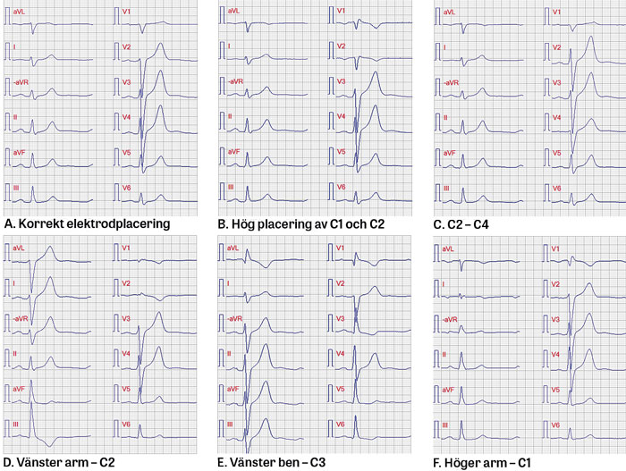 Elektroderna på bröstkorgen (C1–C6) placeras inte sällan antingen ett interstitium upp eller ner på bröstkorgen [16]. Vid alltför kranial placering påverkas ST-sträckan mest för avledning V1 och V2, vilka också blir mer lika varandra (Figur 3 B) [6]. I en studie rapporterades att ST-höjningsinfarkter missades i 11 procent av fallen vid alltför kranial placering av bröstelektroderna [6]. Denna elektrodplacering kan också ge upphov till falskt positivt fynd som vid genomgången hjärtinfarkt (minskad R-vågsamplitud) eller Brugadamönster (avvikande form på ST-sträckan i högersidiga avledningar) [17, 18].