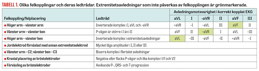 Avsikten med denna artikel är att förklara och exemplifiera vanliga felkopplingsmönster. Eftersom handläggningen av patienten kan påverkas avsevärt av en felaktig EKG-diagnos, är det av värde för såväl den som registrerar EKG som ordinerande läkare att känna till dessa mönster (Tabell 1) [2].