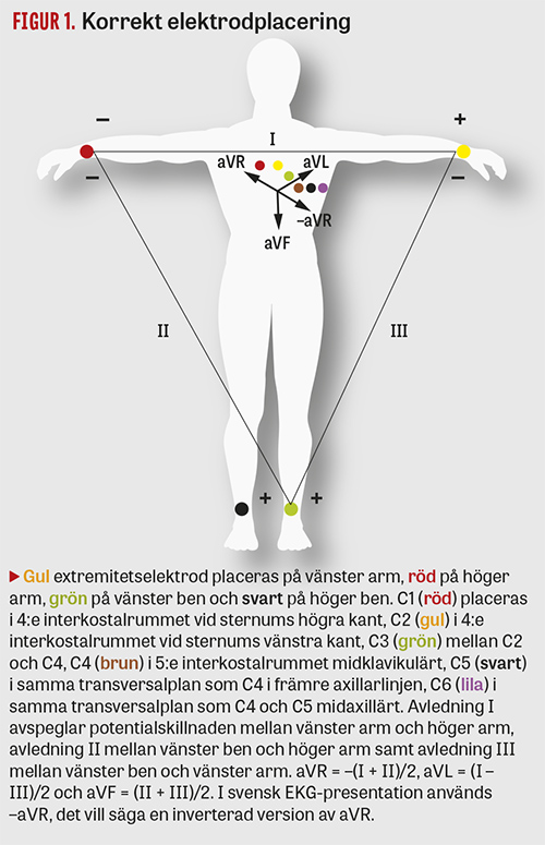 EKG är den i särklass vanligaste kardiologiska undersökningsmetoden. För att EKG ska kunna bedömas adekvat ska det registreras enligt precisa och standardiserade anvisningar [1]. Tre extremitetavledningar (I, II och III) »skapas« från elektroder placerade på vänster arm, höger arm och vänster ben. Dessa tre elektroder skapar även de tre s k unipolära extremitetsavledningarna aVL, –aVR och aVF. Sex elektroder fästs på bröstet (C1–C6) och skapar tillsammans med en sammankoppling av elektroderna på vänster arm, höger arm och vänster ben (den s k Wilsons terminal) de sex bröstavledningarna (V1–V6) [1].