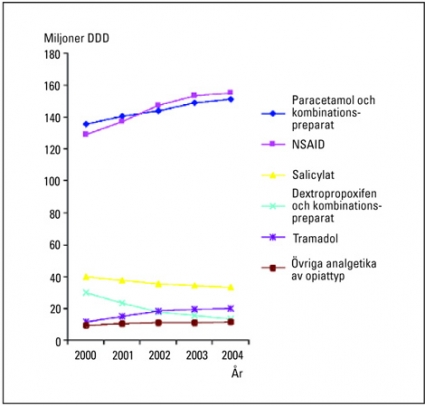 Statistik från Apoteket AB över analgetikaförsäljningen för åren 20000–2004 framgår av Figur 2. Där anges den totala försäljningen för respektive läkemedelsgrupp i miljoner DDD (definierade dygnsdoser).