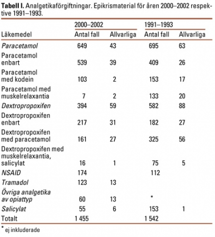 Den vanligaste orsaken till läkemedelsförgiftning är överdosering av psykofarmaka. En nyligen genomförd studie visade att dessa förgiftningar var mer godartade år 2000 än tio år tidigare. När det gäller analgetika kunde man inte se samma gynnsamma utveckling [1]. Det har därför varit motiverat att särskilt studera omfattningen och de eventuella förändringarna när det gäller överdosering av denna grupp av läkemedel.