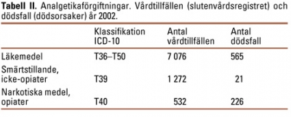 Enligt slutenvårdsregistret vårdades år 2002 drygt 7000 patienter på sjukhus med läkemedelsförgiftning som huvuddiagnos. I ca 25 procent av fallen var orsaken smärtstillande medel eller narkotiska medel av opiattyp (Tabell II).