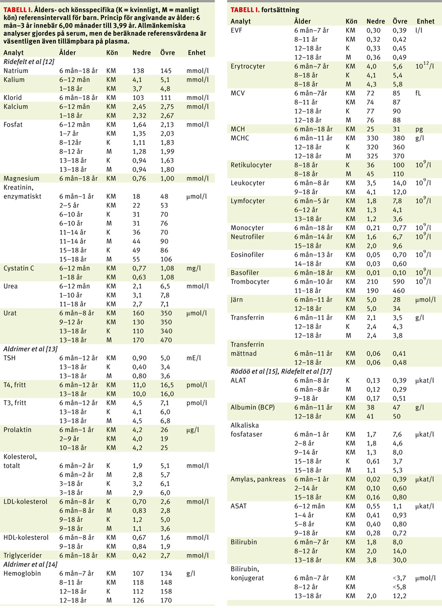 Prospektiva studier av referensintervall för friska barn beträffande de analyser som ingår i våra dygnet runt-sortiment är förvånansvärt få. Många studier är av äldre datum, och analyserna har utförts med metoder och instrument där överensstämmelsen med dagens laboratorieresultat är varierande och där beskrivningen av metoder, reagens och kalibratorer är bristfällig [6].