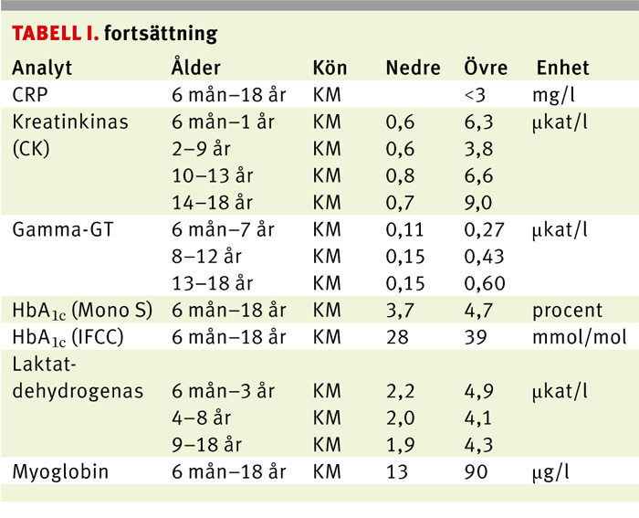 Det kanadensiska projektet CALIPER har under de senaste åren publicerat flera studier på data från mätningar på överblivet provmaterial, uppdelat på olika instrumenttillverkare [7-9]. Under 2012 kom dock ett stort prospektivt arbete från CALIPER [10], där man hade rekryterat 2 188 friska barn i åldern 0–18 år från skolor och kyrkor i Toronto-området. För barn under 1 års ålder tvingades man dock att använda överblivet provmaterial från sjukvården. Arbetet redovisade även en del data efter uppdelning i de största etniska grupperna. Studien omfattade ca 40 allmän- och proteinkemiska analyser utförda med instrument från tillverkaren Abbott. Nyligen publicerades också en studie från Köpenhamn [11]. Den inkluderade 1 429 individer i åldern 6–20 år, där prov samlats in i skolor. I studien analyserades ett 20-tal allmänkemiska analyter med instrument från tillverkaren Roche.