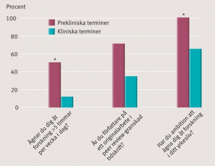 Vid de intervjuer som genomfördes framkom en tydlig skillnad i långsiktigt forskningsintresse mellan de studenter som börjat programmet tidigt jämfört med dem som börjat senare i utbildningen. Vår uppfattning var att de studenter som engagerat sig tidigt hade mer långsiktiga mål med sin forskning och mer konkreta planer på att genomföra en forskarutbildning. För att undersöka detta objektivt indelade vi enkätsvaren i studenter på prekliniska terminer (termin 5 eller tidigare) och kliniska terminer (senare än termin 5). Figur 2 redovisar hur studenter på prekliniska respektive prekliniska terminer svarat på enkätfrågorna.
